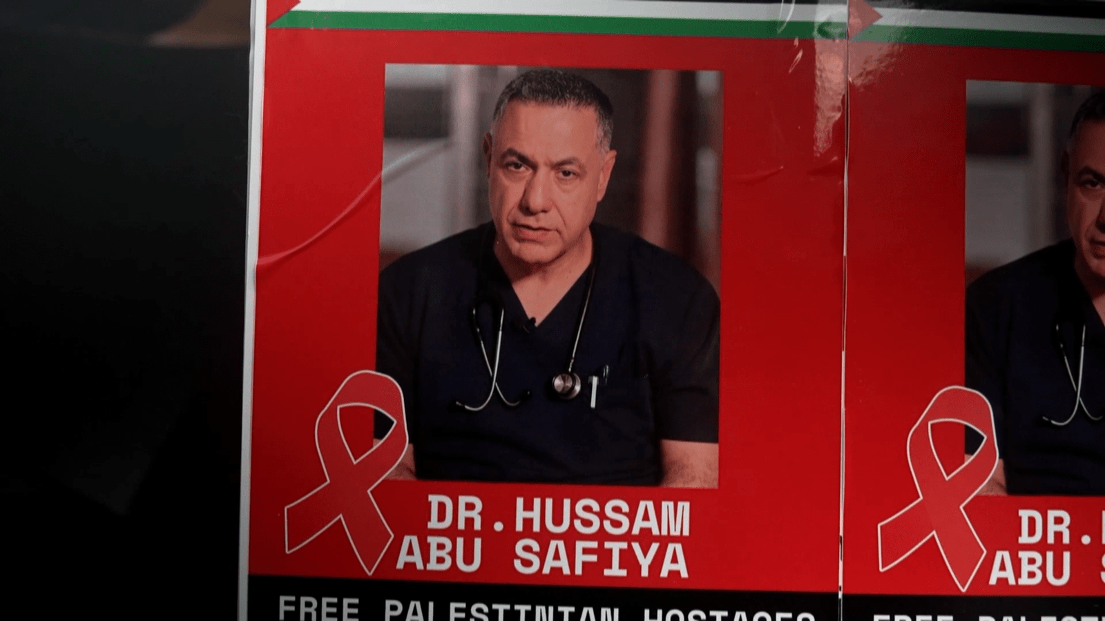 “We are clear about this vocabulary – they are hostages, not like any prisoners, and our symbol today is Dr Hussam Abu Safia,” said Adnan Hmidan, chair of the Palestinian Forum in the United Kingdom and the event organiser.